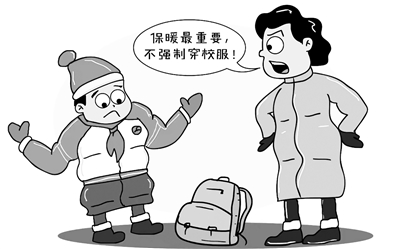 但四季有輪回,冷熱在交替,校服不大可能緊隨季節變化而頻繁更換。沒有適合學生冬季保暖需求的校服,卻硬性要求校服必須套在厚實的棉衣外面,顯然違背常理。好在北京、福建、深圳等多地教育行政部門近日發出通知,提醒做好學生防寒保暖工作,明確提出不得強制要求學生統一穿校服,并合理安排在校戶外活動時間,運動后提醒學生及時穿衣保暖等。這些要求真正體現了對學生的關愛,人性化的管理贏得了家長的歡迎和網友的點贊。當然,學校若根據換季保暖需求,推出棉服、羽絨服等,兼顧整齊統一和防寒保暖,又能在家長的承受范圍之內,也是一個可取的選項。不過還是要注意,校服不是日常服裝,學生不斷成長,身高胖瘦會隨著年齡發生變化,定制多套校服也容易造成社會資源的浪費。