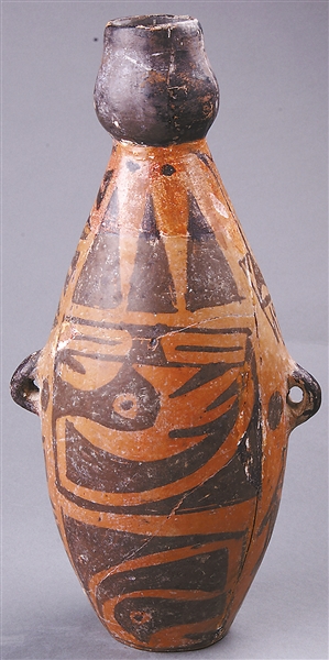 人在仰韶文化中如何被神化?《人面魚紋盆》給了我們一種可能,這件作品也是一種葬具,兩個人面和兩個魚紋組成了一個似乎可以在盆里旋轉的圖案,人的嘴巴里銜著的好像是魚骨,耳朵的位置則是兩條魚像耳朵一樣作為裝飾,人物的頭頂是帶著三角形的裝飾圖案,充滿了神秘感。或許人面魚紋中,人的形象早已超越了人的存在。我們能夠在魚紋和鳥紋的演化中,看到原始人藝術創造的超越性。