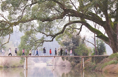 近日,湖南省懷化市通道侗族自治縣播陽鎮(zhèn)上湘村,教師帶領(lǐng)學(xué)生從古樹群下的木橋上走過。通道侗族自治縣積極鼓勵(lì)中小學(xué)校充分利用鄉(xiāng)村良好的生態(tài)資源優(yōu)勢,攜手林、農(nóng)、工等崗位專技“教師”,開展多姿多彩的校外科普實(shí)踐活動(dòng)。粟勇主 吳永東 攝