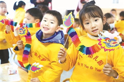 日前,江蘇省連云港市連云區墟溝街道南山社區與轄區八一幼兒園聯合開展“巧手做舞龍 傳承龍文化”主題活動。孩子們在志愿者引導下,用靈巧的小手,對材料進行拼接、粘貼,制作出一條條漂亮的拉花舞龍。圖為孩子們在展示自己的作品。通訊員 朱華南 攝