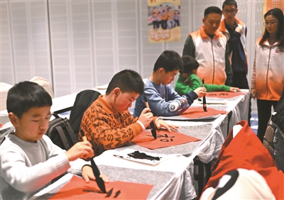 1月31日,寒托班的同學們在寫福字。近日,上海市首次開辦小學生愛心寒托班。春節前,記者走進位于上海市松江區中山街道中建·幸孚公寓的辦班點,這里開辦了全市首個“新時代城市建設者管理者子女愛心寒托班”。本次寒托班主要招收外賣騎手、快遞員、網約車司機等新就業青年群體的子女,且不限上海學籍,以緩解這些青年家庭的寒假“看護難”問題。新華社記者 劉穎 攝