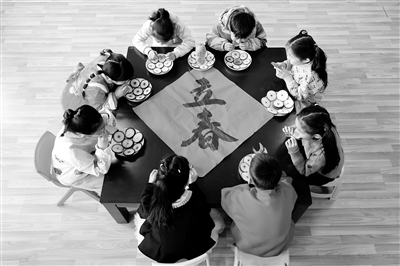 2月4日,山東省棗莊市光明路街道東盛社區活動室,小朋友在吃蘿卜“咬春”。當日是立春節氣,我國民間有吃蘿卜、吃春餅等“咬春”的習俗,寓意迎新納吉。