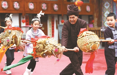 2月4日,廣西桂林市龍勝各族自治縣平等鎮廣南村,村里的老人帶孩子們一起舞草龍。立春當日,廣南村的侗族老少身著盛裝,舉行鬧春牛、春牛巡游祈福、舞草龍、演唱琵琶歌等民俗活動,喜迎新春到來。粟勇主 攝