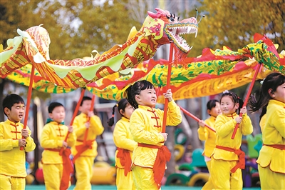 二月二,龍抬頭。3月11日,江蘇省海安高新區海南幼兒園的孩子們在操場上舞龍。當日,該園的孩子們通過舞祥龍、賽龍舟、吃龍食、剃喜頭等一系列民俗活動,感受熱鬧的節日氛圍,體驗傳統文化的快樂。翟慧勇 攝