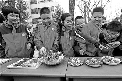 近日,甘肅省平涼市崆峒區西大街小學教育集團學生欣賞各班選手制作的果盤。該校通過分年級組織開展疊被子、拼果盤等比賽,開展“勞體融合 成就你我”技能比賽,提高學生自理能力。吳希會 攝