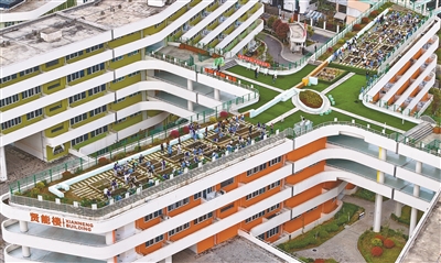 3月25日,在成都市中和中學樓頂農田,中學生開展春季農作物播種勞動實踐(無人機照片)。該校在教學樓樓頂建有一片“空中農田”,各班級負責管理“責任田”。學生在老師的指導下參與種植玉米、茄子、西紅柿等多種農作物,感受勞動帶來的快樂。新華社發