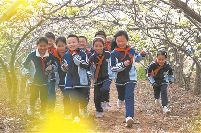 4月8日,在山東濰坊高密市膠河生態發展區,祝家莊小學學生在梨園里快樂奔跑。在該校周邊田野里,梨花、桃花、油菜花競相開放,一片生機盎然,學生在教師指導下賞花、嬉戲、體驗勞動,在燦爛的花海中感受春天。李海濤 攝