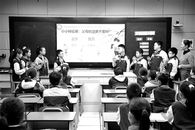 學校每學期舉行“雛鳳競鳴”辯論大會,通過層層選拔、晉級,邀請專家、師生、家長、社會人士擔任評委,網絡全程直播,促進兒童提升思維和表達能力。