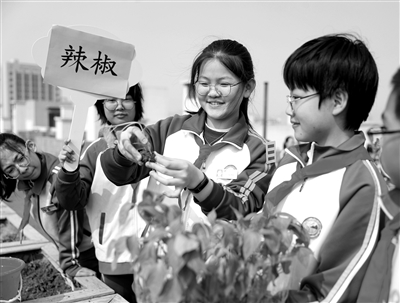 近日,在山東省青島市西海岸新區膠南小學的樓頂農場,學生們開展春季勞動實踐。該校利用校園建筑樓頂平臺,開辟了樓頂小農場,由每個班級管理一塊“責任田”。在教師的帶領和指導下,學生們參與蔬菜、中藥材的種植管護,在勞動實踐中磨煉意志,培養勤儉節約、熱愛勞動的良好習慣。