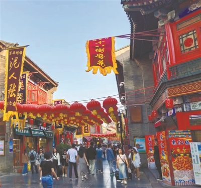 記者行走在天津古文化街,兩旁古香古色的店鋪鱗次櫛比,五顏六色的彩旗迎風搖曳,一串串大紅燈籠橫跨街道,各種吆喝聲此起彼伏,店家們走上街頭招攬著川流不息的游人,這座環渤海而建、因漕運而興的城市散發出獨特的“煙火氣”和濃厚的文化氣息。