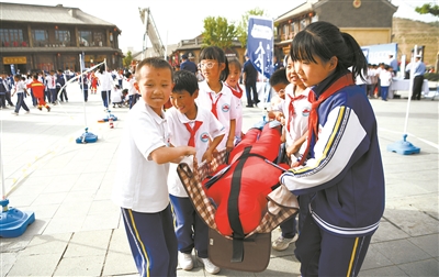 5月10日,在陜西省延安市,學生體驗應急處置措施。第16個全國防災減災日前夕,各地開展形式多樣的防災減災知識普及和應急疏散演練等活動,提高人們應急避險與安全自救能力。新華社記者 張博文 攝