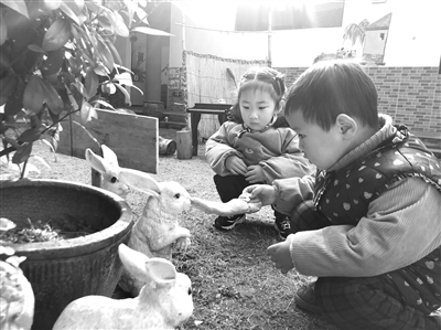 在創(chuàng)建江蘇省優(yōu)質(zhì)幼兒園的兩年中,在不斷接受指導(dǎo)、審議和不斷獲得新知的過(guò)程中,我們發(fā)現(xiàn)了園內(nèi)獨(dú)有的庭院式建筑風(fēng)格之下自然形成的6個(gè)院落這一特征。在接下來(lái)的戶外游戲空間打造中,我們開(kāi)始賦予不同院落不同的游戲功能,“游戲功能院落”逐漸成形。“趣樂(lè)小院”是角色扮演主場(chǎng)地。“悠樂(lè)小院”內(nèi)有水缸游戲探究,有養(yǎng)殖走廊,孩子們?cè)诖苏疹櫷米印⑶謇硗酶C、收集兔糞后供給園內(nèi)花草樹(shù)木。“歡樂(lè)小院”內(nèi)有多種入園路線、竹林迷宮,以及為一公里內(nèi)“自駕”入園孩子們?cè)O(shè)置的“停車(chē)場(chǎng)”。“野樂(lè)小院”內(nèi)孩子們種植、寫(xiě)生、捉蟲(chóng),也是幼兒園獨(dú)創(chuàng)的“小院茶”的誕生地。“嬉樂(lè)小院”有沙水泥池,也是運(yùn)動(dòng)主場(chǎng)地。“小院河畔”是教師自主研發(fā)改造的拓展體能區(qū)域,柵欄外農(nóng)家散養(yǎng)了雞鴨鵝,是孩子們散步、逗樂(lè)、觀察的好去處。