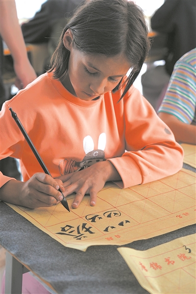 每到周末和寒暑假,在五十一團(tuán)二小就讀的11歲女孩蘇海巴,都會(huì)和爸爸媽媽一起來(lái)到這里,蘇海巴在書(shū)院學(xué)書(shū)法、唱歌和跳舞,爸爸媽媽在家庭工坊工作。