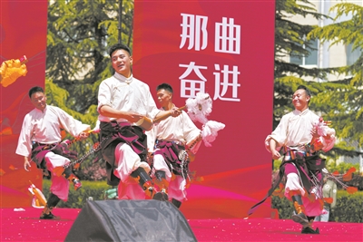 5月12日,在西藏職業(yè)技術(shù)學(xué)院職業(yè)教育活動(dòng)周啟動(dòng)儀式暨比如縣非物質(zhì)文化遺產(chǎn)進(jìn)校園活動(dòng)上,比如縣民族藝術(shù)團(tuán)的演職人員在表演節(jié)目。新華社發(fā)(趙大志 攝)