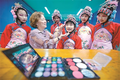 近日,山西省聞喜縣禮元中心校裴柏小學戲曲社團老師給學生化妝。近年來,聞喜縣通過開展“戲曲進校園”活動,傳播戲曲藝術,讓學生在學習戲曲表演的同時感受傳統文化的魅力,豐富課余文化生活。