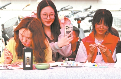 為讓社區(qū)文化生活錦上添花,求知書院美術(shù)學(xué)、環(huán)境藝術(shù)設(shè)計專業(yè)學(xué)生開展了校園寫生、色彩涂鴉、書法篆刻活動。工業(yè)設(shè)計專業(yè)碩士研究生李直澄創(chuàng)作了“萬物共悅”主題的井蓋涂鴉作品,她說:“我很享受這種藝術(shù)表達(dá)方式,感覺我們的生活環(huán)境更有溫度了。”