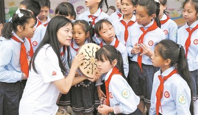 5月29日,在重慶市九龍坡區銅罐驛實驗學校的操場上,在該校支教的音樂老師李玲莉(前排左一)向“渝好”歡唱團學生們介紹樂器發出的聲音特點。