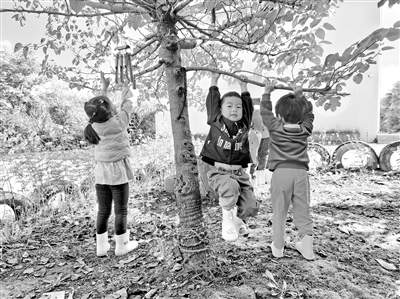 從“我”到“我們”。當(dāng)孩子們的游戲越來越豐富,相互之間也有了更多合作與謙讓:有了小紛爭(zhēng),有“小裁判”評(píng)理;為摘到最高處的桃子,齊心協(xié)力搬來桌子、凳子、梯子,架著扶著還不忘叮嚀“小心點(diǎn)兒”……孩子們心中越來越有愛,并漸漸化為行動(dòng)。小班的鑫鑫身體較弱,上臺(tái)階對(duì)他是個(gè)挑戰(zhàn)。當(dāng)他在臺(tái)階前徘徊時(shí),大班一個(gè)哥哥伸出的手給了他勇氣。慢慢地,伸出的手越來越多,所有孩子不管年齡大小,只要看到他,都會(huì)特意等他,并一路護(hù)送到教室。在接納、包容與互助中,孩子們從“我”慢慢變成了“我們”。