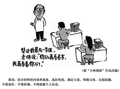 不少人認(rèn)為這幅漫畫(huà)的核心題旨是頌揚(yáng)師生情。如若此判斷成立,那么用這樣的一幅漫畫(huà)頌揚(yáng)師生情,似乎并不典型。教師為救護(hù)學(xué)生,舍生忘己,獻(xiàn)出生命;教師為幫扶學(xué)生,帶入自己家中,視為己出,一心養(yǎng)育:這樣的師生情似乎比題目所傳達(dá)的更為深摯感人。小林漫畫(huà)的原作,老師說(shuō)的話是,“你們?cè)倏纯淳碜樱以倏纯茨銈儭!泵}者將原作中的“卷子”換作了“書(shū)”。從某種狀況上說(shuō):“你們?cè)倏纯淳碜印钡谋硎觯歉蠂?guó)情的,這亦是希望準(zhǔn)確捕捉民眾心態(tài)的小林老師所追求的。但命題者更希望,用“看看書(shū)”來(lái)呈現(xiàn)教育的核心追求與內(nèi)在期待。因此,借教師之口傳達(dá)而出。
