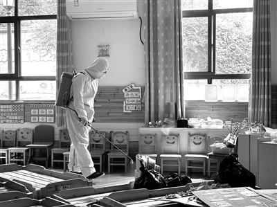 6月20日,安徽省黃山市屯溪區遭遇洪水。當地教育系統齊心協力、共渡難關。目前全區62所小學和公民辦幼兒園均已基本完成清淤打掃和消殺工作,力爭以最短時間做好各項復課準備工作,讓學生重返校園。圖為工作人員在教室進行消殺。