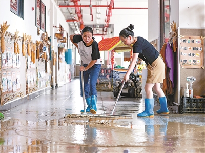 近日,貴州省銅仁市玉屏侗族自治縣第五幼兒園教師在清理校園里的淤泥。連日來,玉屏侗族自治縣遭受暴雨洪澇災(zāi)害,部分小學(xué)、幼兒園被淹,當(dāng)?shù)亟逃块T積極組織抗洪搶險,確保學(xué)校正常上課。 胡攀學(xué) 攝