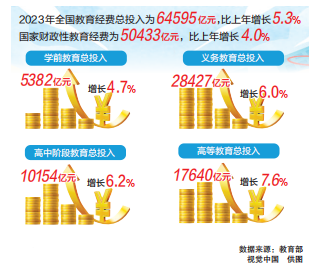 快報顯示,2023年全國教育經費總投入為64595億元,比上年增長5.3%。其中,國家財政性教育經費為50433億元,比上年增長4.0%。2023年全國學前教育、義務教育、高中階段教育、高等教育經費總投入分別為5382億元、28427億元、10154億元、17640億元,比上年分別增長4.7%、6.0%、6.2%、7.6%。