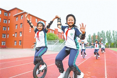 ⑤吉林省長春市綠園區同心小學學生在學校“活力操場”上騎獨輪車。 吉林省教育廳供圖