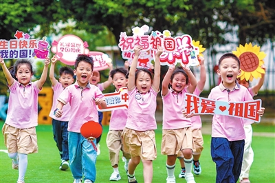 9月26日,在江蘇省興化市四牌樓幼兒園,小朋友們手持祝福標語奔跑。國慶節臨近,多地幼兒園、小學舉辦形式多樣的國慶主題趣味活動,歡樂迎國慶。