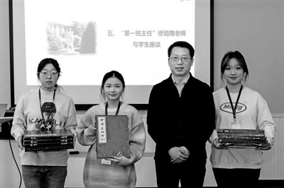 首都師范大學(xué)黨委書記、“第一班主任”繆勁翔(右二)向君頎書院學(xué)生贈(zèng)送《中華美德古訓(xùn)》,希望學(xué)生們傳承中華優(yōu)秀傳統(tǒng)文化。資料圖片