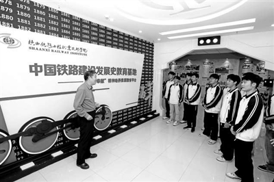 陜西鐵路工程職業技術學院黨委書記焦勝軍(左一)為學生講述中國鐵路建設發展歷程。資料圖片