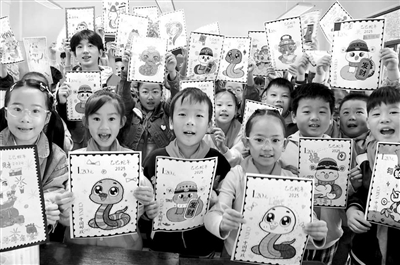 10月8日,在江蘇省鎮(zhèn)江市南徐小學(xué),江蘇科技大學(xué)志愿者和小學(xué)生一起展示設(shè)計(jì)繪制的蛇年生肖郵票。當(dāng)日,志愿者來到南徐小學(xué),指導(dǎo)學(xué)生設(shè)計(jì)、繪制蛇年生肖郵票,迎接“世界郵政日”的到來。石玉成 攝