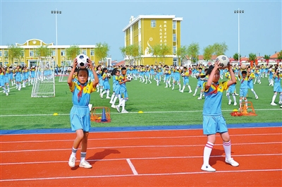 黑龍江省齊齊哈爾市泰來縣大興鎮(zhèn)中心學(xué)校的學(xué)生們在做大課間足球操,身后的樓外墻體上醒目地寫著“按教育方針辦學(xué),走內(nèi)涵發(fā)展道路”。該校的樓內(nèi)樓外、主要會議室中都有與教育方針相關(guān)的學(xué)校文化標(biāo)識。 資料圖片