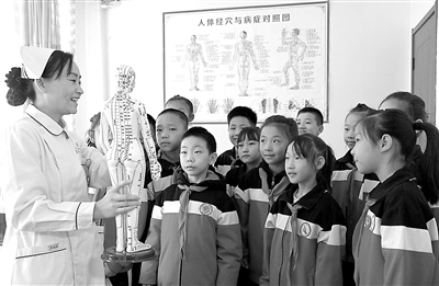 10月21日,在河北省邯鄲市第四醫院中醫科,醫務人員向當地峰峰礦區第三小學的學生們講解人體穴位。“世界傳統醫藥日”(每年10月22日)到來之際,該校組織學生走進醫院,感受傳統中醫藥的魅力。