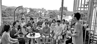 暑假,張春燕(左二)和學生們一起在洱海邊讀書、唱歌。(作者供圖)