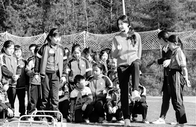 10月24日,“奔跑吧·少年”2024年體育支教冠軍校園行暨冠軍公益夢想行動進校園貴州普安站舉行,運動員們走進學校與學生們同上體育課,參與運動項目普及推廣,傳播中華體育精神。圖為運動員夏思凝在與學生上趣味田徑課。王浩 攝