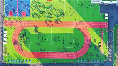 11月11日,長春市第一實驗銀河小學學生在操場上進行課間活動(無人機照片)。11月11日開始,吉林省長春市中小學課間活動時長延長至15分鐘。各學校紛紛制定多樣化的課間活動內容,讓學生在課間“動起來”“玩起來”。