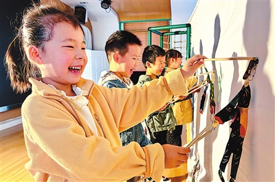 11月14日,在浙江省湖州市長興縣水木花都幼兒園,孩子們體驗非遺皮影戲。長興縣教育部門挖掘利用本地鄉土文化資源,組織百葉龍、下箬馬燈、木偶戲等民俗文化和民間技藝進校園活動近百場。