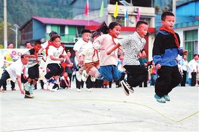 11月14日,貴州省黔東南苗族侗族自治州從江縣剛邊壯族鄉中心小學學生在跳繩。近年來,該校注重培養和引導學生養成良好的體育運動習慣,讓學生增強體質、健康成長。羅京來 攝