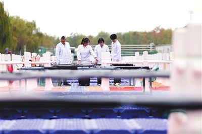 11月14日,王賀(左二)和團隊成員在上海海洋大學(xué)內(nèi)交流研討。今年28歲的王賀是上海海洋大學(xué)水產(chǎn)養(yǎng)殖專業(yè)的博士研究生。王賀和團隊經(jīng)常來到位于浙江武義的淡水珍珠科技小院,開展淡水珍珠培育工作,開發(fā)受市場歡迎的高質(zhì)量淡水珍珠產(chǎn)品。團隊培育的“申浙3號”產(chǎn)大規(guī)格無核珍珠和有核珍珠比例均提高20%以上,入選2023年全國重點推廣水產(chǎn)品種。新華社記者 方欣 攝