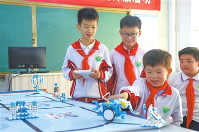 日照市新?tīng)I(yíng)小學(xué)學(xué)生在控制機(jī)器人完成文藝表演任務(wù)。 本報(bào)記者 單藝偉 攝