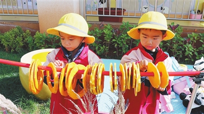 日前,云南省會澤縣寶云幼兒園舉行了“曬曬收獲的果實”活動,幼兒剝豆子、切蘿卜……這些活動既讓幼兒直觀認識了收獲的農作物,也讓他們了解了不同果蔬的特征及營養價值。圖為幼兒在曬南瓜。 馬金友 吳思嫻 攝