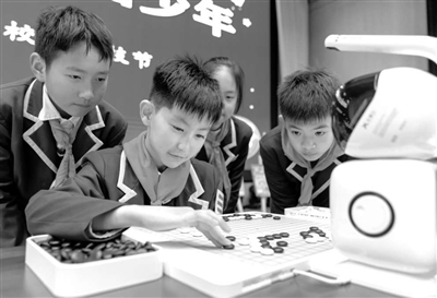11月26日,在校園科技節上,江蘇海安高新區實驗小學學生與機器人下圍棋。該校舉行以“追科技之光 做強國少年”為主題的校園科技節,通過視覺體驗、人機互動等形式,讓孩子們感受科技的魅力,激發他們對科學的興趣。