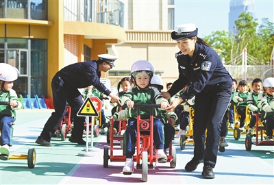 11月29日,在江西省贛州市章貢區(qū)第十九保育院,民警同小朋友玩交通安全游戲。“全國(guó)交通安全日”(12月2日)到來(lái)之際,各地開(kāi)展交通安全主題宣傳教育活動(dòng),提高學(xué)生交通安全意識(shí)和自我保護(hù)能力。新華社發(fā)