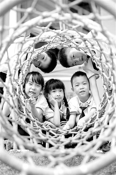 首都師范大學幼兒園的孩子們在鉆爬網。 資料圖片