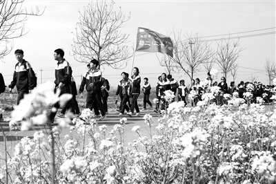 ③山東省東阿縣南湖行知學校組織黃河大堤遠足拉練。資料圖片