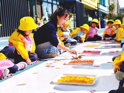 ①無錫市鈴蘭實(shí)驗(yàn)幼兒園教師在教孩子做手工。王辰予 攝