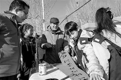 現(xiàn)場洋溢著濃濃的年味兒。孩子們鋪紙研墨,一筆一畫盡顯專注。稚拙有力的筆觸中,飽含著對新年的美好期許,傳遞著新春的喜悅。往來群眾紛紛駐足欣賞,眼中滿是贊許:“這手寫的春聯(lián)可比印刷的有年味兒多了,孩子們真了不起!”
