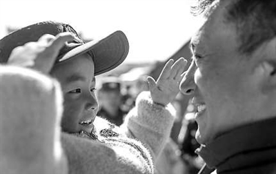 在定日縣長所鄉嘎布村,一個孩子戴上警察米瑪次仁的帽子敬禮(1月14日攝)。