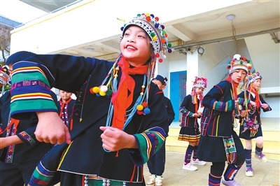景洪市勐龍鎮中心小學勐宋完小四年級學生跳起哈尼族舞蹈。