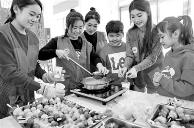 1月23日,河北省秦皇島市海港區(qū)河?xùn)|街道工人北里社區(qū)志愿者帶領(lǐng)小朋友制作冰糖葫蘆。當(dāng)日,該社區(qū)開展“串童年趣味 共迎新春佳節(jié)”活動(dòng),社區(qū)志愿者帶領(lǐng)小朋友體驗(yàn)制作糖葫蘆,豐富假日生活,共同迎接新春佳節(jié)。 曹建雄 攝
